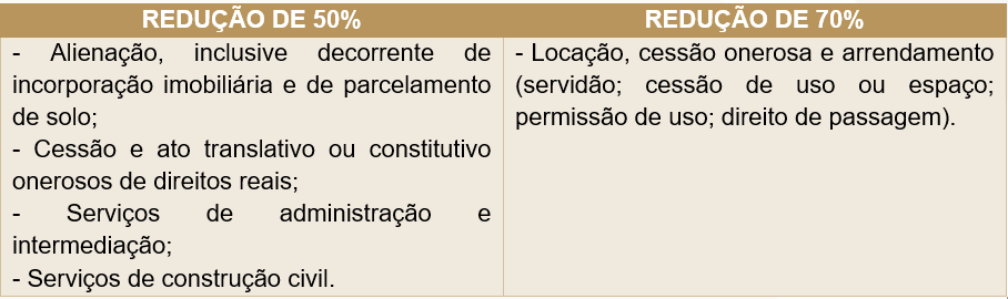 A legislação estabeleceu reduções específicas de alíquotas, conforme a natureza da operação: